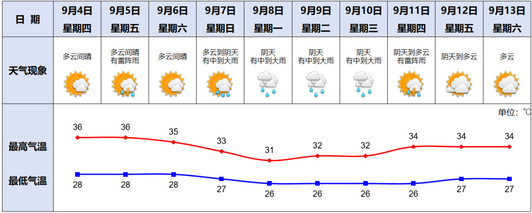 9月4日,多云间晴,28~36℃,相对湿度45%~80%;5日多云间晴,有雷阵雨,28~36℃;6日多云间晴,28~35℃。(荔湾区气象台9月3日17时发布)