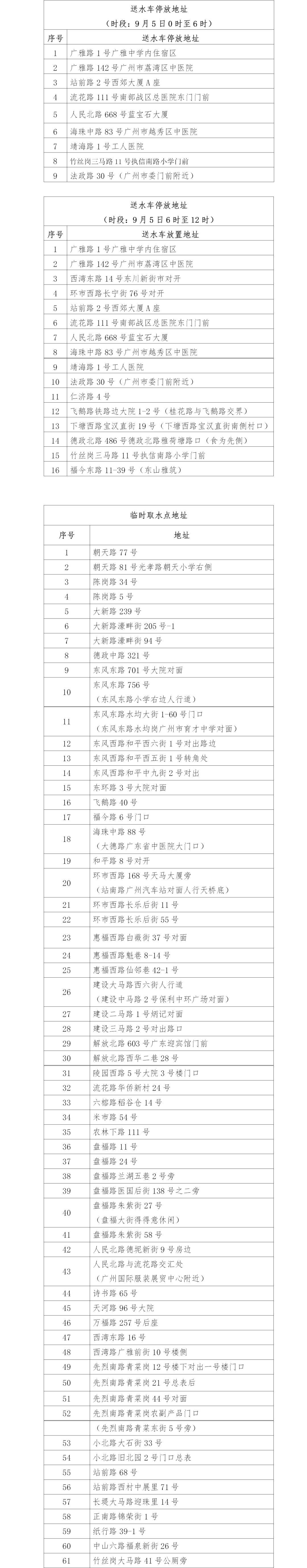 广州市自来水有限公司表示,已通过优化供水调度,将影响降至最低,同时积极采取应急用水保障措施,尽量减少附近居民基本生活用水的影响,9月5日凌晨0时至6时安排9台应急送水车,9月5日白天6时至12时安排16辆应急送水车,设置61个临时取水点在受影响区域提供取水服务。